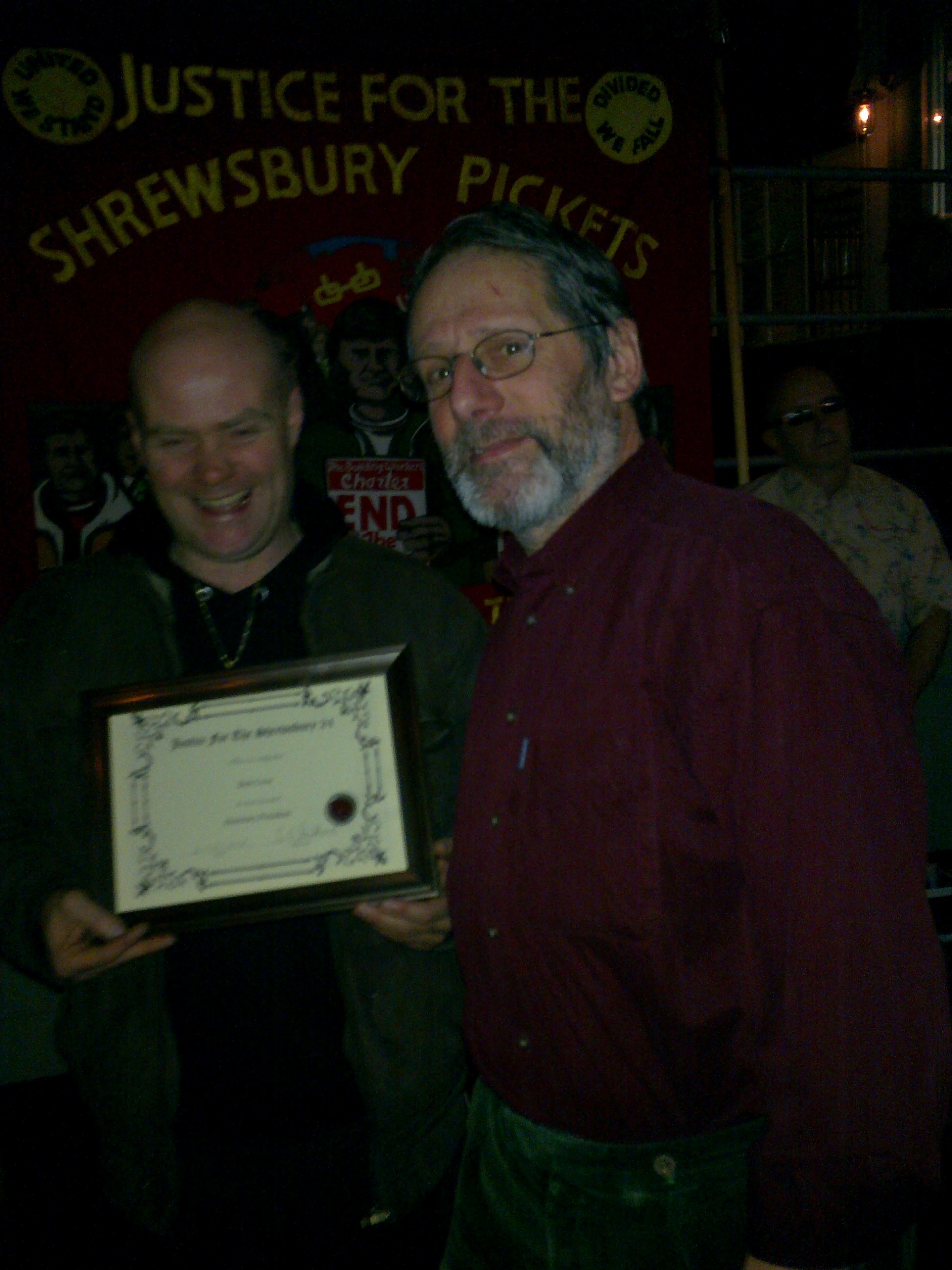 Steve Ballard (right) (Editor – Defend Trade Unions section) awarding a certificate